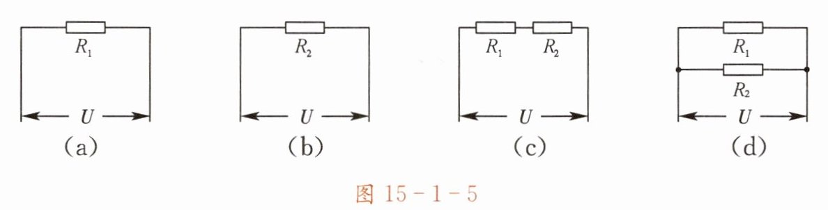 例题4 如图15-1-5所示,若电源电压相等,电阻$R_1<R_2$,且通电时间相同,则下列四个电路中电流所做的总功按从大到小排列的顺序是(
