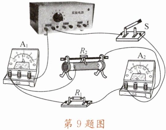 9. 如图所示的电路中,电源电压恒定,滑动变阻器$ R_2$上标有“$20\ \Omega\ 1\ A$”字样。将滑片置于最右端后,闭合开关,电流表$ A_1$、$ A_2$的示数分别为0.8 A、0.3 A。在电路安全工作时,下列选项中正确的是(