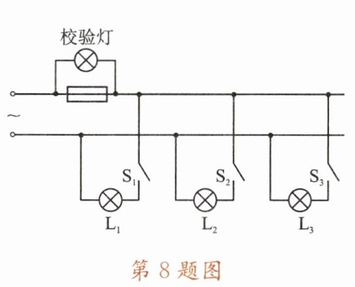 8. 为检查照明电路的故障,电工经常采用的方法是:取下熔丝,将额定电压为220 V的校验灯接在熔丝的两个接线柱上,如图所示,先断开所有开关,再试着闭合某一支路的开关。下列说法中正确的是(