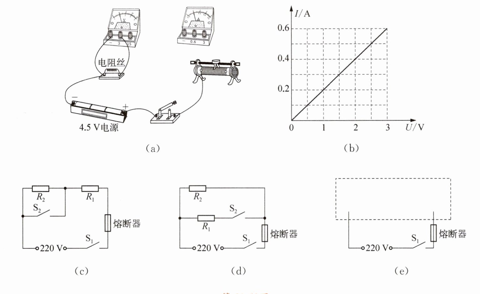 (2) 小明选择以下器材来制作电加热器:熔断器(允许通过的最大电流为12 A),$ R_1$、$ R_2$是重新截取的两段电阻丝,$ R_1$长22 cm,开关若干,导线若干。