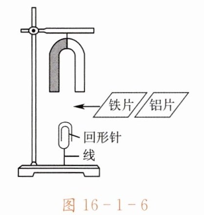 例题4 用如图16-1-6所示的装置进行实验探究,研究对象有铁片、铝片、玻璃片、纸片、钢片。将这些物体分别置于蹄形磁体与回形针之间,请将实验探究的结果填写在下表中。