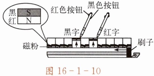 9. 图16-1-10是双色磁性画板的截面,磁粉浸没在悬浮液里。按下写字笔黑色按钮时写出黑色的字,按下红色按钮时写出红色的字,而刷子左右移动时画板上的字将被擦去。下列说法中正确的是(