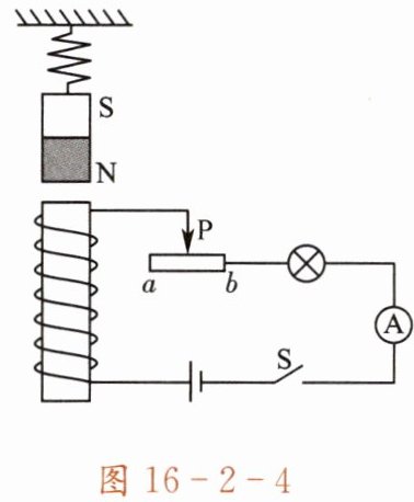 例题1 如图16-2-4所示,在电磁铁的正上方挂着一块条形磁体,开关S闭合后,将滑片P从a端向b端滑动,出现的现象是(