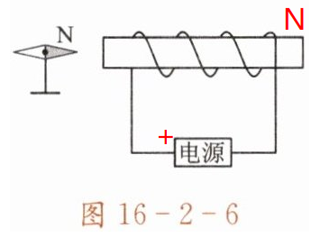 1. 螺线管通电时,小磁针的指向如图16-2-6所示,请标出通电螺线管的N极及电源的正极。