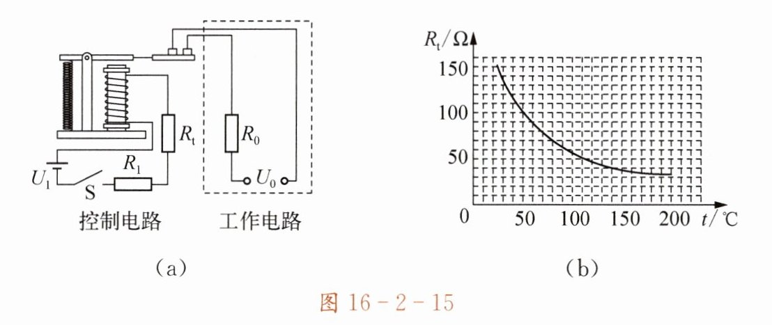 丝组成;控制电路是由电压$U_{1}$=7.5V的电源、开关、电磁继电器(线圈电阻不计)、阻值$R_{1}$=60Ω的定值电阻和热敏电阻$R_{t}$组成,热敏电阻$R_{t}$的阻值随温度变化的关系如图16-2-15(b)所示。当保温箱中的温度达到设定温度(即控制电路的电流达到50mA)时,工作电路自动切断从而停止加热。