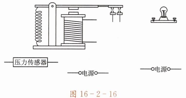 压力传感器(当压力达到设定值时,它就接通电路)、电磁继电器,设计一个车辆超重的报警装置。当车辆超重时,信号灯就发光。请你在图16-2-16中为他连接好电路。