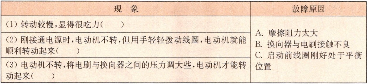 3. 组装直流电动机并接通电源后,出现如下表所示的现象,请从右列选择相应的故障原因填写在左边的括号内(填字母)。