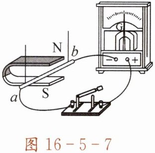 5. 如图16-5-7所示,蹄形磁体和铜棒ab均水平放置。闭合开关后,水平向左移动铜棒,灵敏电流计G的指针向左偏转。下列说法中正确的是(