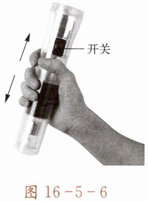 3. 图16-5-6是一种手摇发电的手电筒,其内部除灯泡、导线外,只有固定的线圈和可来回运动的条形磁体。当闭合开关后沿图中箭头方向来回晃动手电筒时,灯泡发光。手电筒中的线圈相当于