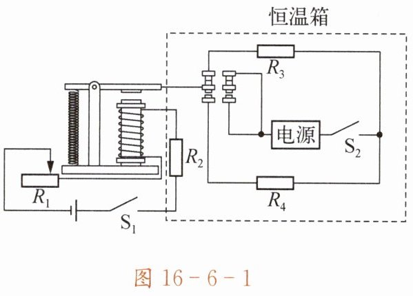 1. 寒冬,为了给小鸡提供温暖的环境,小明制作了一个恒温箱,其原理如图 16-6-1 所示。控制电路由电磁继电器、滑动变阻器 $R_1$、热敏电阻 $R_2$(安装在恒温箱内,阻值随温度升高而显著减小)、低压电源等组成。加热电路由电源、电热丝 $R_3$ 和 $R_4$ 等组成。调节 $R_1$ 阻值,闭合开关 $S_1$、$S_2$,箱内温度升高到设定值后即在小范围内波动,且降温比较平缓。