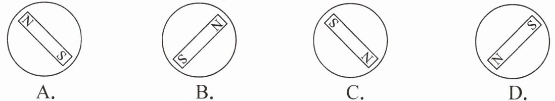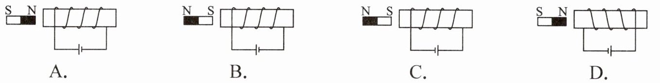D选项:电流从螺线管左端流入,右端流出,螺线管左端为N极,右端为S极。条形磁体左端为S极,右端为N极,螺线管左端(N极)与条形磁体右端(N极)相互排斥,不符合题意。