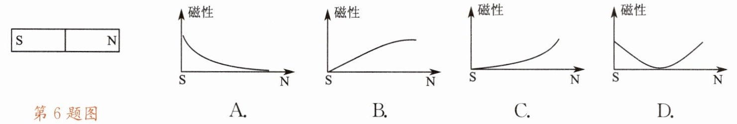 6. 如图所示,一块条形磁体,其左端为S极,右端为N极。下列选项中能大致正确表示从S极到N极磁性强弱变化情况的是(