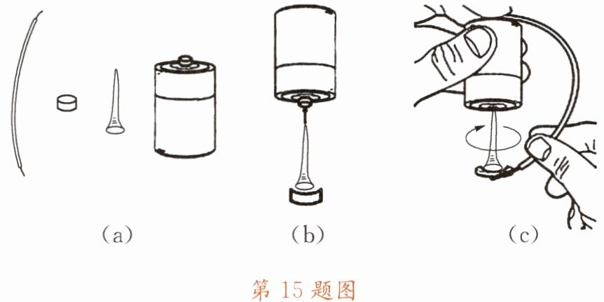 15. 用一根铁钉、一节干电池、一根导线和一个纽扣形强磁体可以组装成一个演示用的简易电动机,组装过程如图所示。