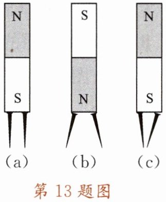 13. 如图所示,一根条形磁体的一个磁极吸起两枚大头针,小华说两枚大头针会保持平行,如图(a)所示;小红说两枚大头针下端将会张开,如图(b)所示;小明说两枚大头针将会靠拢,如图(c)所示。