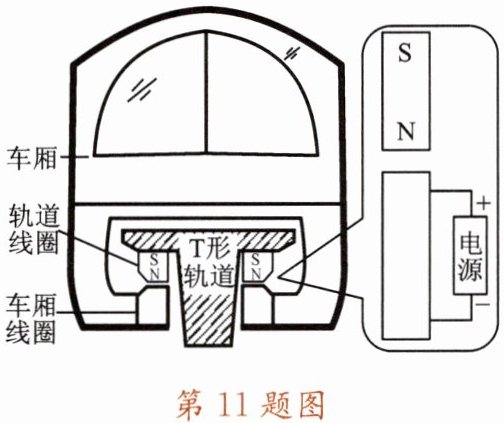 11. 如图所示是某磁悬浮列车的悬浮原理示意图。请在右侧放大的图中画出轨道下方的车厢线圈的绕线。