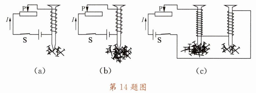 答案:14. (1) 吸引大头针的数量 (2) 在线圈匝数相同的条件下,通过电磁铁的电流越大,磁性越强 (3) 在通过电磁铁电流相等的条件下,线圈匝数越多,磁性越强