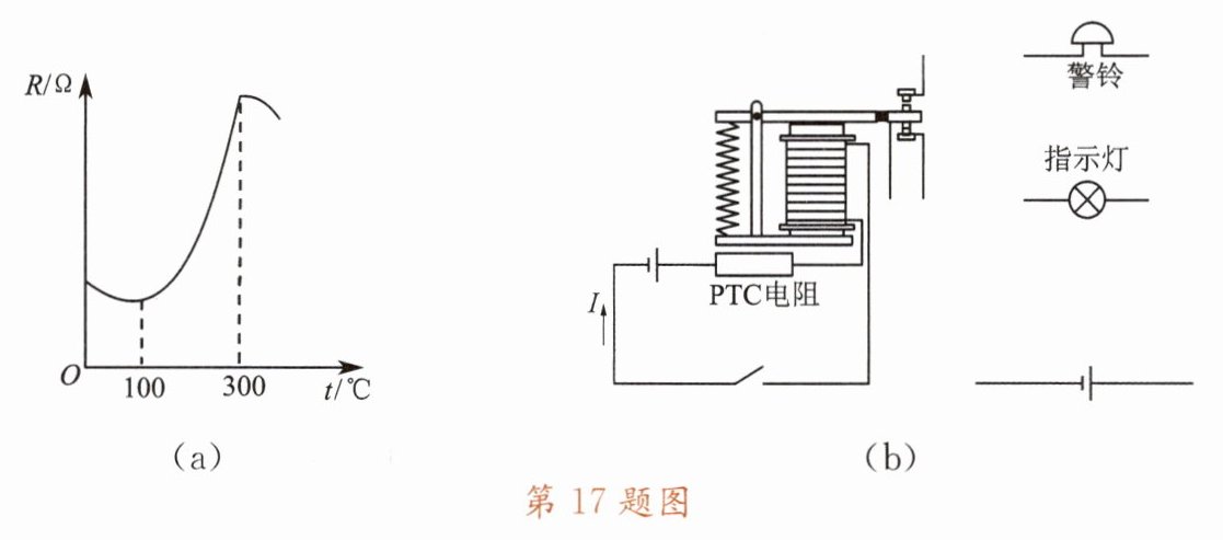 (3)某同学利用PTC电阻设计了一个“过热自动报警电路”:将PTC电阻安装在需要探测温度的地方,当环境温度正常时,指示灯亮;当环境温度超过PTC电阻的转变温度时,指示灯熄灭,警铃响。请帮他将图(b)所示的电路连接完整。