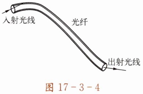光纤是一种由玻璃或塑料制成的纤维。 如图 17-3-4 所示,光可以从弯曲的光纤的一端传到另一端,而不会“溜”出光纤。 光在光纤中每次由光纤内层的玻璃芯射向与外层的分界面时,只会发生反射,而没有折射。 这是因为光从玻璃斜射入空气中时,折射角大于入射角。 当入射角增加到某一角度时,折射角先达到 90°,此时的入射角叫临界角,入射角再增大时,折射光消失,只剩下反射光,即发生全反射。