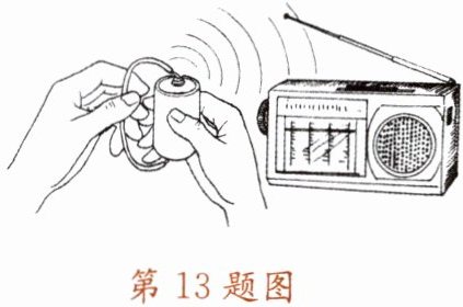13. 打开收音机的开关,将旋钮调到没有电台的位置,并将音量调高。取一节旧的干电池和一根导线,靠近收音机,将导线的一端与电池的一极相连,再用导线的另一端与电池的另一极时断时续地接触,如图所示,会听到收音机发出“咔咔”声,这一现象验证了