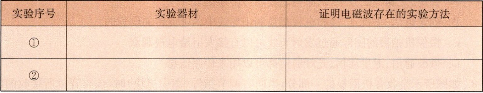12. 爱因斯坦曾说过:“磁场在物理学家看来正如他坐的椅子一样实在。”磁场虽然看不见、摸不着,但可以通过对小磁针的作用证明其存在。电磁波也是这样。试设计两个简易实验证明电磁波的存在,并完成下表。