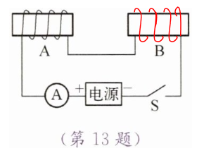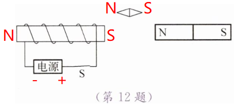 3. 电源正负极:根据安培定则(右手螺旋定则),通电螺线管左端为N极,四指弯曲方向为电流方向,可知电流从螺线管左端流入、右端流出,因此电源左端为正极,右端为负极。