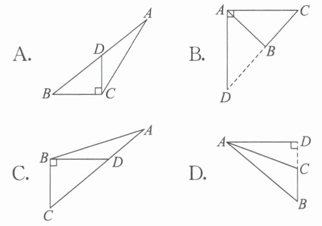 根据三角形高的定义,从三角形的一个顶点向它的对边所在直线作垂线,顶点和垂足之间的线段叫做三角形的高。边BC上的高应是从顶点A向BC所在直线作垂线,垂足为D,则AD为BC边上的高。选项A中是过D作BC的垂线,D不是顶点;选项B中是过A作AC的垂线,不是BC边上的高;选项C中是过B作BC的垂线,不是从A作;选项D符合从A向BC所在直线作垂线。