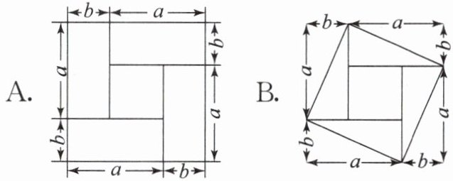 要验证$(a + b)^2=(a - b)^2 + 4ab$,需大正方形(边长$a + b$)面积等于小正方形(边长$a - b$)面积与4个面积为$ab$的图形面积之和。选项A中,大正方形边长为$a + b$,可分割为中心边长$a - b$的小正方形和四周4个面积为$ab$的长方形,总面积为$(a - b)^2 + 4ab$,等于大正方形面积$(a + b)^2$,符合公式。