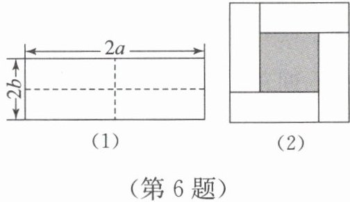 6. 在一次数学活动中,小红将一个长为$2a$、宽为$2b$的长方形沿如图(1)所示的虚线用剪刀均分成四个全等的小长方形,然后按图(2)的方式拼成一个正方形。小红通过观察图(1)(2),用两种不同的方法表示出了图(2)中阴影部分的面积,并得出$(a + b)^{2}$,$(a - b)^{2}$,$ab$这三个代数式之间的一个等量关系。