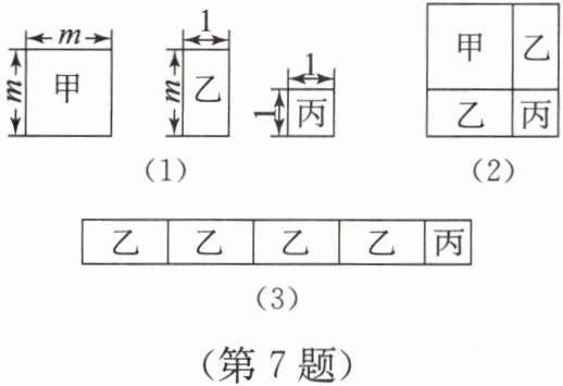 答案:(1) 由图可知,甲卡片面积为 $m^2$,乙卡片面积为 $m × 1 = m$,丙卡片面积为 $1 × 1 = 1$。