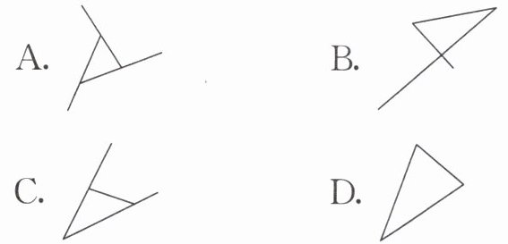 根据三角形的定义,由不在同一条直线上的三条线段首尾顺次相接所组成的图形叫做三角形。观察各选项,A、B、C选项中的图形线段未首尾顺次相接或存在线段交叉,D选项符合三角形定义。