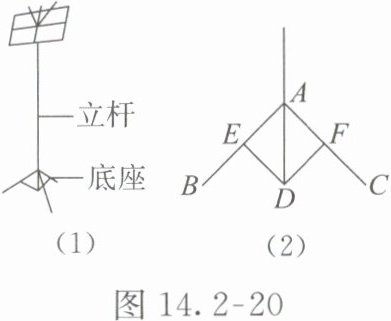 · 跟踪练习2 图 14.2-20(1)是一乐谱架示意图,利用立杆可进行高度调节;图 14.2-20(2)是乐谱架底座部分的平面图,其中支撑杆 AB=AC,E,F 分别为 AB,AC 的中点,ED,FD 是连接立杆和支撑杆的支架,且 ED=FD。立杆在伸缩过程中,总有△AED≌△AFD,其判定依据是(