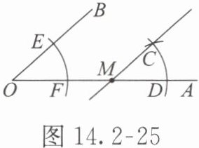 (注:此处需根据题目提供的图14.2-25保留作图痕迹,包括以O为圆心画弧交OA于F、交OB于E,以M为圆心画弧交OA于D,以D为圆心、EF长为半径画弧交前弧于C,连接MC的痕迹。)