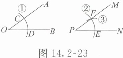 · 跟踪练习1 如图 14.2-23,用直尺和圆规作∠MPN=∠AOB 的过程中,弧③是(