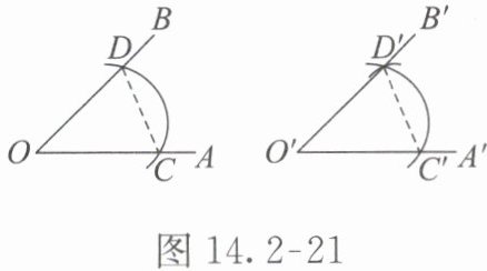用直尺和圆规作一个角等于已知角的作法:如图 14.2-21。