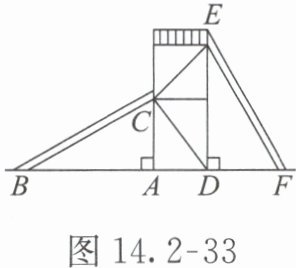 【例 2】如图 14.2-33,有两个长度相同的滑梯靠在垂直于地面的架子上,左边滑梯的高 AC 与右边滑梯水平方向的长 DF 相等。若∠CBA=36°,则∠EFD=(
