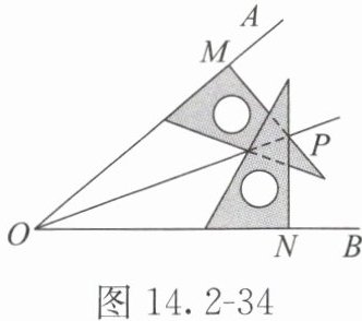 · 跟踪练习2 用三角尺画角的平分线:如图 14.2-34,先在∠AOB 的两边分别取 OM=ON,再分别过点 M,N 作 OA,OB 的垂线,交点为 P,连接 OP。得到 OP 平分∠AOB 的依据是(