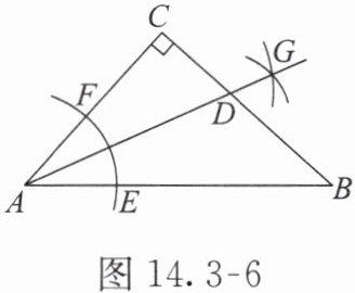 · 跟踪练习1 如图 14.3-6,在 $△ ABC$ 中,$∠ C=90°$,$∠ CAB=48°$。按下列步骤作图:①以点 $A$ 为圆心,小于 $AC$ 的长为半径作弧,分别交 $AB$,$AC$ 于点 $E$,$F$;②分别以点 $E$,$F$ 为圆心,大于 $\frac{1}{2}EF$ 的长为半径作弧,两弧在 $∠ CAB$ 的内部相交于点 $G$;③作射线 $AG$,交边 $BC$ 于点 $D$。则 $∠ ADC=$(