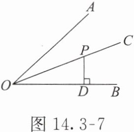 【例 2】如图 14.3-7,$OC$ 平分 $∠ AOB$,点 $P$ 在 $OC$ 上,$PD ⊥ OB$,$PD=2$,则点 $P$ 到 $OA$ 的距离是(