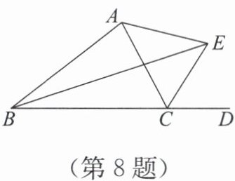 8. 如图,$∠ ACD$是$△ ABC$的外角,$∠ BAC=80°$,$∠ ABC$和$∠ ACD$的平分线相交于点$E$,连接$AE$,则$∠ CAE=$