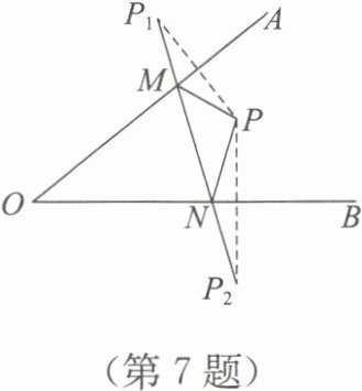 7. 如图,∠AOB 内一点 P, P₁, P₂ 分别是点 P 关于 OA, OB 的对称点,P₁P₂ 交 OA 于点 M, 交 OB 于点 N. 若△PMN 的周长是 10 cm,求 P₁P₂ 的长.