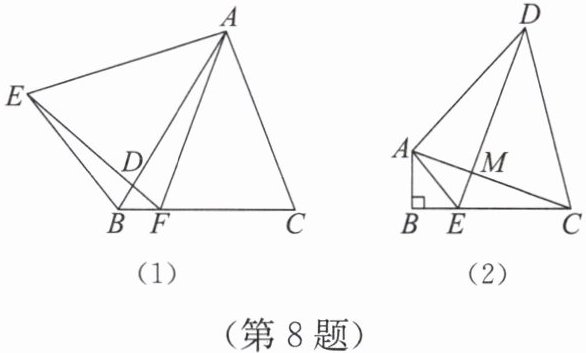 8. (1)【发现问题】如图 (1),在△ABE 与△ACF 中,AB=AE,AC=AF,∠BAE=∠CAF,B,F,C 三点在同一条直线上,连接 EF 交 AB 于点 D。求线段 BC 与 ED,DF 的数量关系,并说明理由。