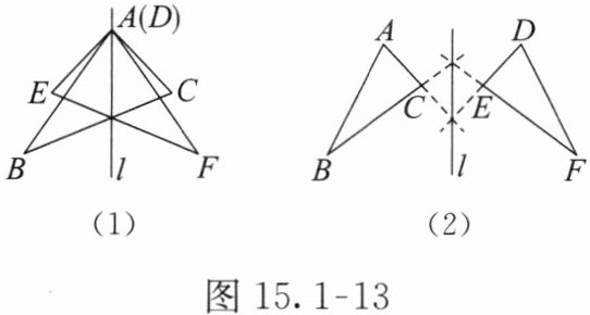 如图 15.1-13 (2),过 BC,FE 的延长线的交点和 AC,DE 的延长线的交点作直线,该直线就是所求作的直线 l。