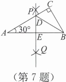 7. (创新考法) 如图,在 Rt△ABC 中,∠C=90°,∠A=30°。按下列步骤作图:分别以点 A,B 为圆心,大于 $\frac{1}{2}AB$ 的长为半径作弧,两弧相交于点 P,Q,作直线 PQ,交 AC 于点 D,交 AB 于点 E,连接 BD。下列结论:① AD=BD;② ∠CBD=30°;③ S△ABC=4S△BCD。其中正确的个数为(