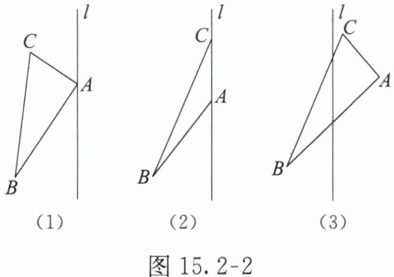 【例 1】在图 15. 2-2 中画$△ A'B'C'$,使$△ A'B'C'$与$△ ABC$关于直线$l$成轴对称.