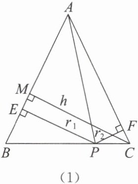 7. 【阅读材料】如图(1),在△ABC中,AB = AC,P为底边BC上一点,点P到两腰的距离分别为r₁,r₂,腰上的高为h,连接AP,则S△ABP + S△ACP = S△ABC. 即$\frac{1}{2}$AB·r₁ + $\frac{1}{2}$AC·r₂ = $\frac{1}{2}$AB·h. 所以r₁ + r₂ = h(定值)。即PE + PF为定值。