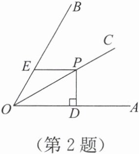 2. 如图,已知∠AOB = 60°,OC平分∠AOB,点P在OC上,PD ⊥ OA,垂足为D,OP = 8 cm,E是射线OB上的动点,则PE的最小值为(