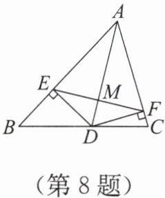 8. 如图,AD是△ABC的角平分线,DE,DF分别是△ABD和△ACD的高,连接EF,交AD于点M. 若∠B + ∠C = 120°,请探究AM与DM之间的数量关系,并证明你的结论。
