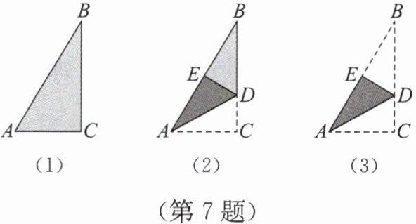 7. 如图(1),已知一张三角形纸片ABC. 如图(2),将纸片折叠,使点C落到边AB上的点E处,折痕为AD. 如图(3),再将纸片沿DE折叠,使点B恰好与点A重合。原三角形纸片ABC中,∠B =(
