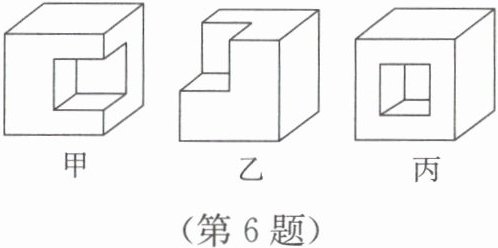 乙:在棱上挖去小正方体,减少$2$个小正方形面,增加$4$个小正方形面,表面积为$24a^2 - 2a^2 + 4a^2 = 26a^2$。