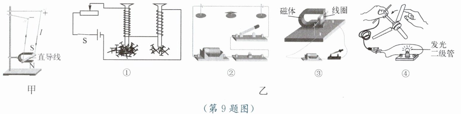 9. 如图甲所示,给直导线(铝棒)通电,直导线会运动。图乙四个现象的实验结论能解释直导线运动原因的是 (